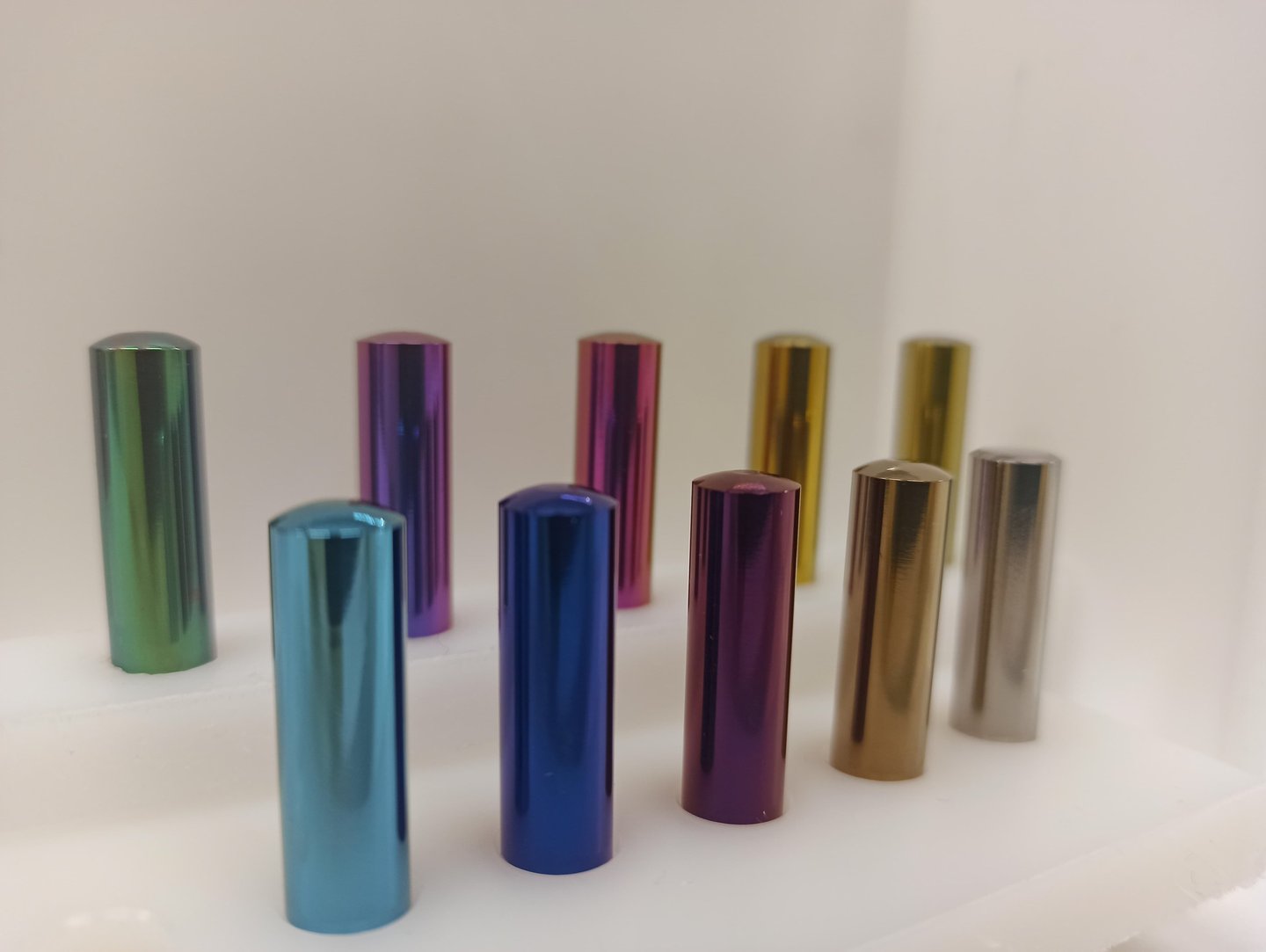Titanium anodization is an electrochemical process that increases the natural oxide layer on titanium, creating vibrant colors through light interference – without any dyes or pigments.